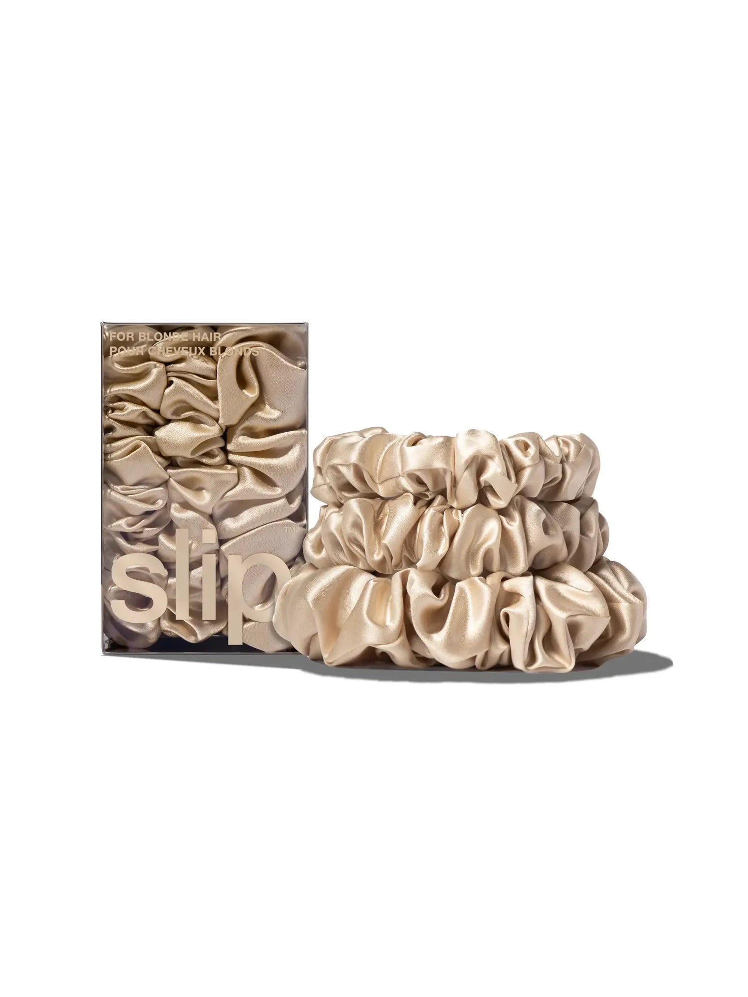This set includes: 2 x blonde slipsilk™ midi scrunchies and 1 x black slipsilk™ large scrunchie.